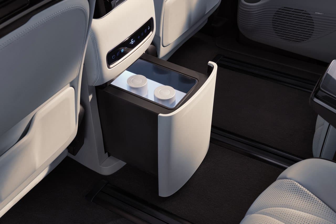 The middle row has a smart beverage cabinet with a heating/cooling box, electric tray, and cup holders. The box supports cloud control, a forgotten-item reminder, and a temperature range -6 °C to 50 °C.